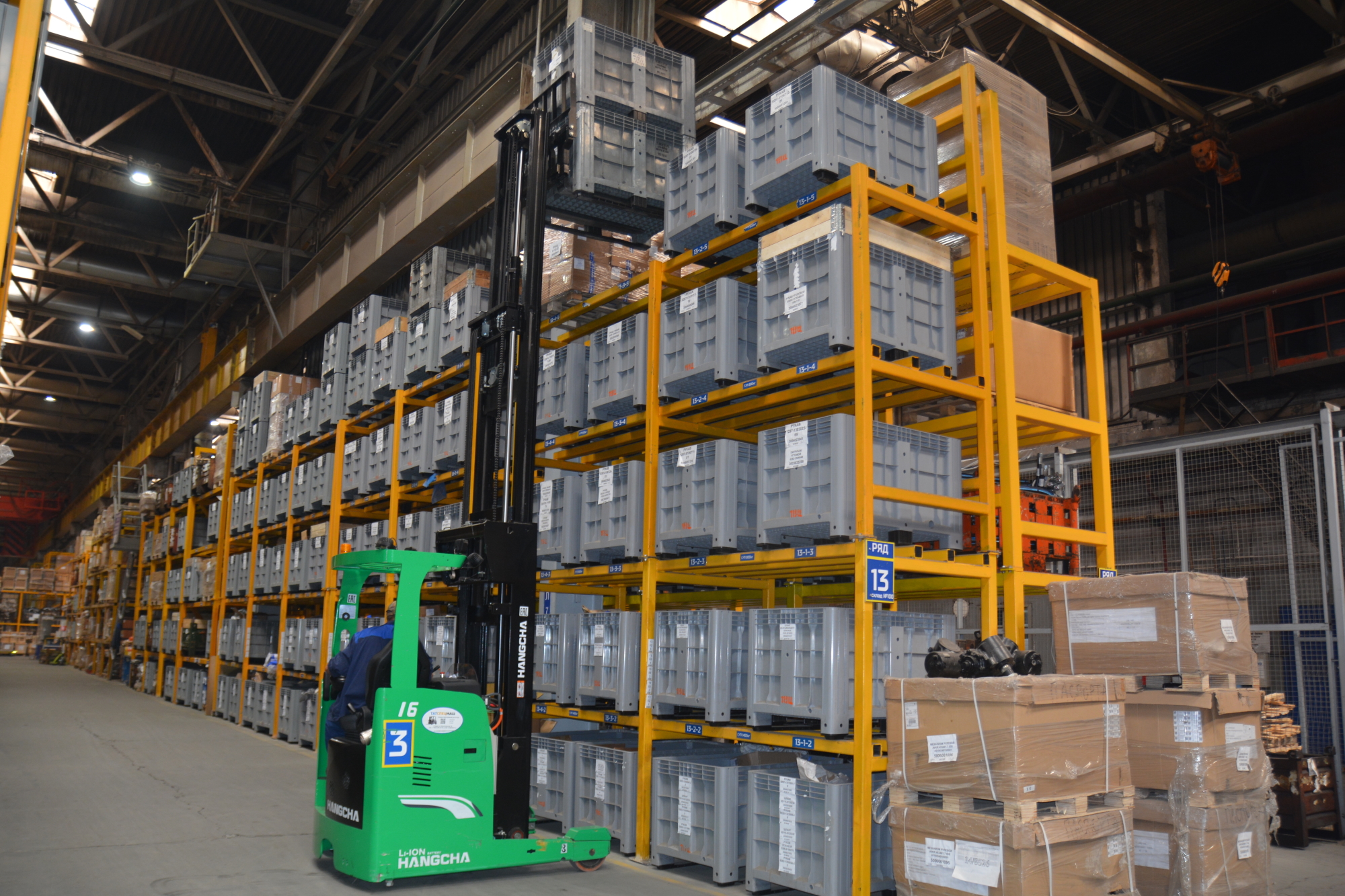 Закупленные для завода ричтраки – это штабелеры с выдвигающейся мачтой, предназначенные для обслуживания высотных стеллажных систем. Они отличаются высокой грузоподъёмностью (до 1600 кг) и идеально подходят для работы в узких проходах и ограниченном пространстве. Ричтраки используются для погрузки и разгрузки поставляемых комплектующих изделий на центральном складе, а погрузчик обслуживает цех сборки автосамосвалов №5. С поступлением новинок общее число задействованной на центральном складе автотехники достигло девяти единиц.